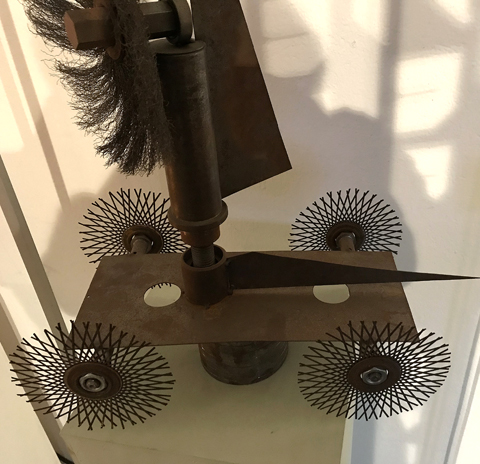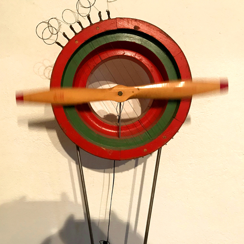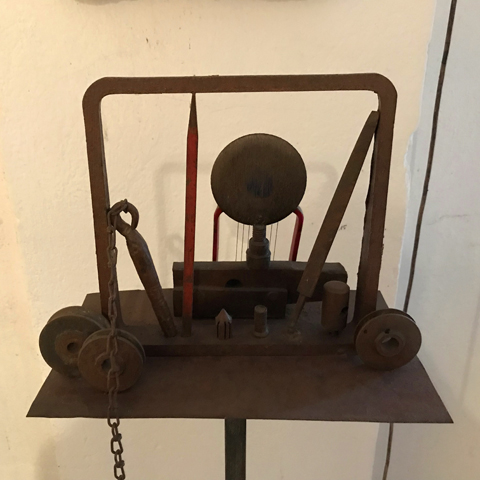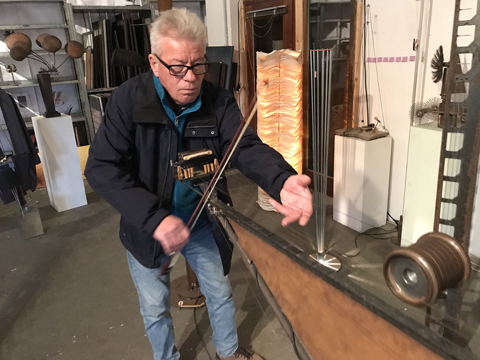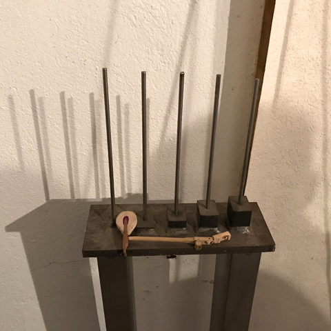 "Das beeindruckendste 'Instrument' ist das Klangmobil. Der Resonanzkörper des Klangmobils besteht aus einem auf einer Spitze stehenden Dreieck, das von drei langen Metallstäben gebildet wird und beweglich auf Kugeln gelagert ist. Das Innere des Dreiecks wird von Metallplatten ausgefüllt, aus denen wiederum ein Halbkreis ausgespart ist. 16 Saiten sind parallel zu den drei Metallstäben gespannt. Oben über den längsten Stab sind acht Saiten gespannt. Über sechs dieser acht Saiten kann der Spieler oder die Spielerin eine Rolle laufen lassen, während er/sie die anderen Saiten zupft, streicht oder mit dem Klöppel bearbeitet. Dadurch wird zum jeweiligen Spiel automatisch eine zweite Stimme erzeugt.