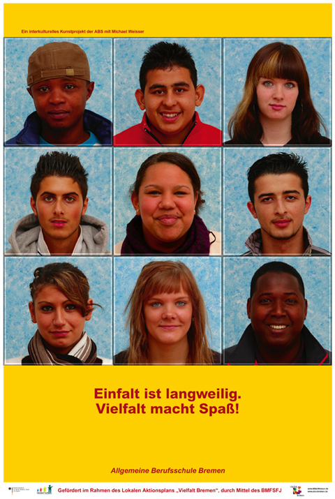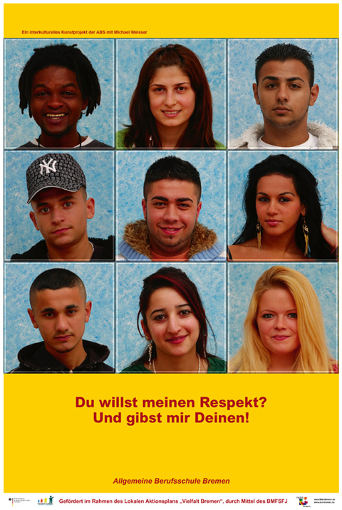 Ein soziokultureller Kunstprozess mit SchülerInnen der ABS-Bremen. Präsentation der entstehenden Poster (Portraits mit persönlichen Statements zu Vielfalt, Respekt und Toleranz) im Walle-Center Bremen 2008.
