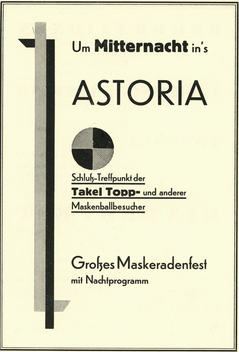 1928 - "Takel Topp", Illustrationen von Willy Menz in der Broschüre zum Fest vom "Künstlerbund Bremen e.V." am 4. und 6. Februar 1928 in sämtlichen Räumen der Centralhallen. Holzstich im Bildformat 14 x 20,5cm.