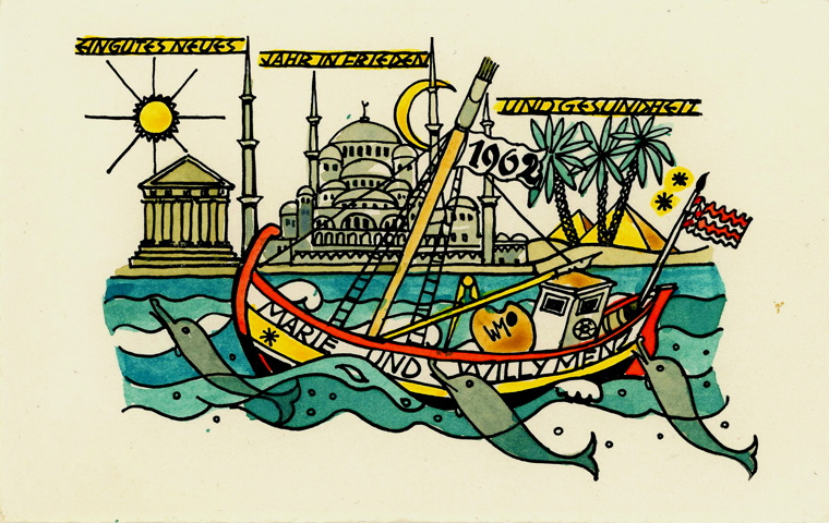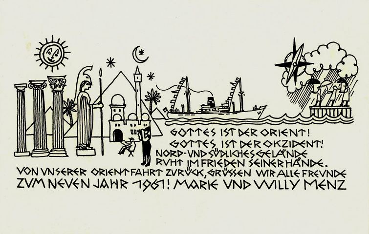 1961 - "Gottes ist der Orient! Gottes ist der Okzident. Nord- und südliches Gelände ruht im Frieden seiner Hände. Von unserer Orientfahrt zurück, grüssen wir alle Freunde zum neuen Jahr 1961! Marie und Willy Menz"
