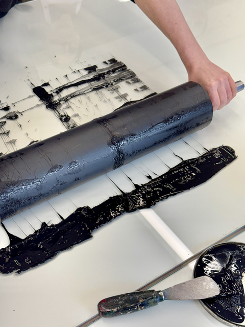 2. Das Aufwalzen der Druckfarbe auf den Druckstock.