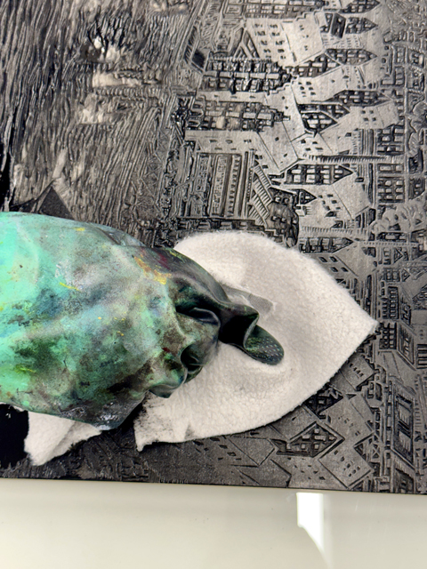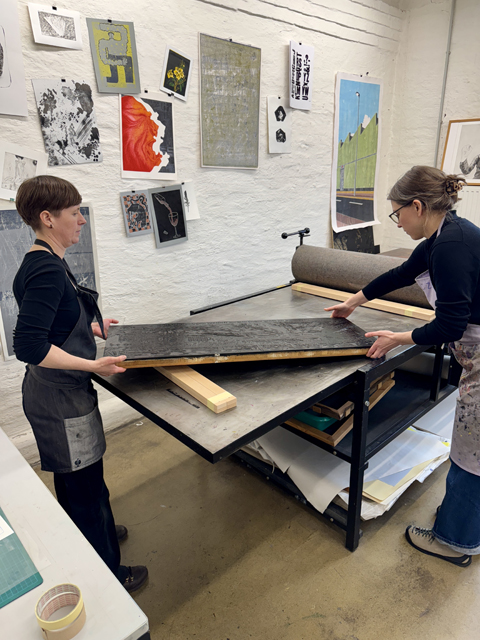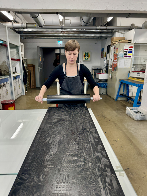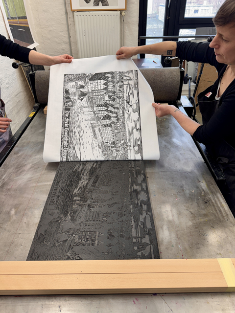 Als Einblick in die Druckwerkstatt wurden im Verlauf der "Hochschultage" der "Hochschule für Künste Bremen" am 15. und am 16. Februar 2025 verschiedene Abzüge vom Druckstock "Bremen" (Menz) erstellt.