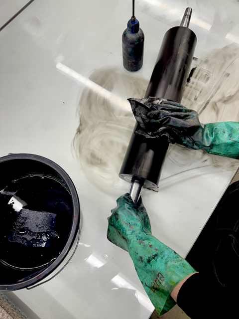 1. Das Aufwalzen der Druckfarbe auf eine Glasplatte zur gleichmäßigen Verteilung der Pigmente.