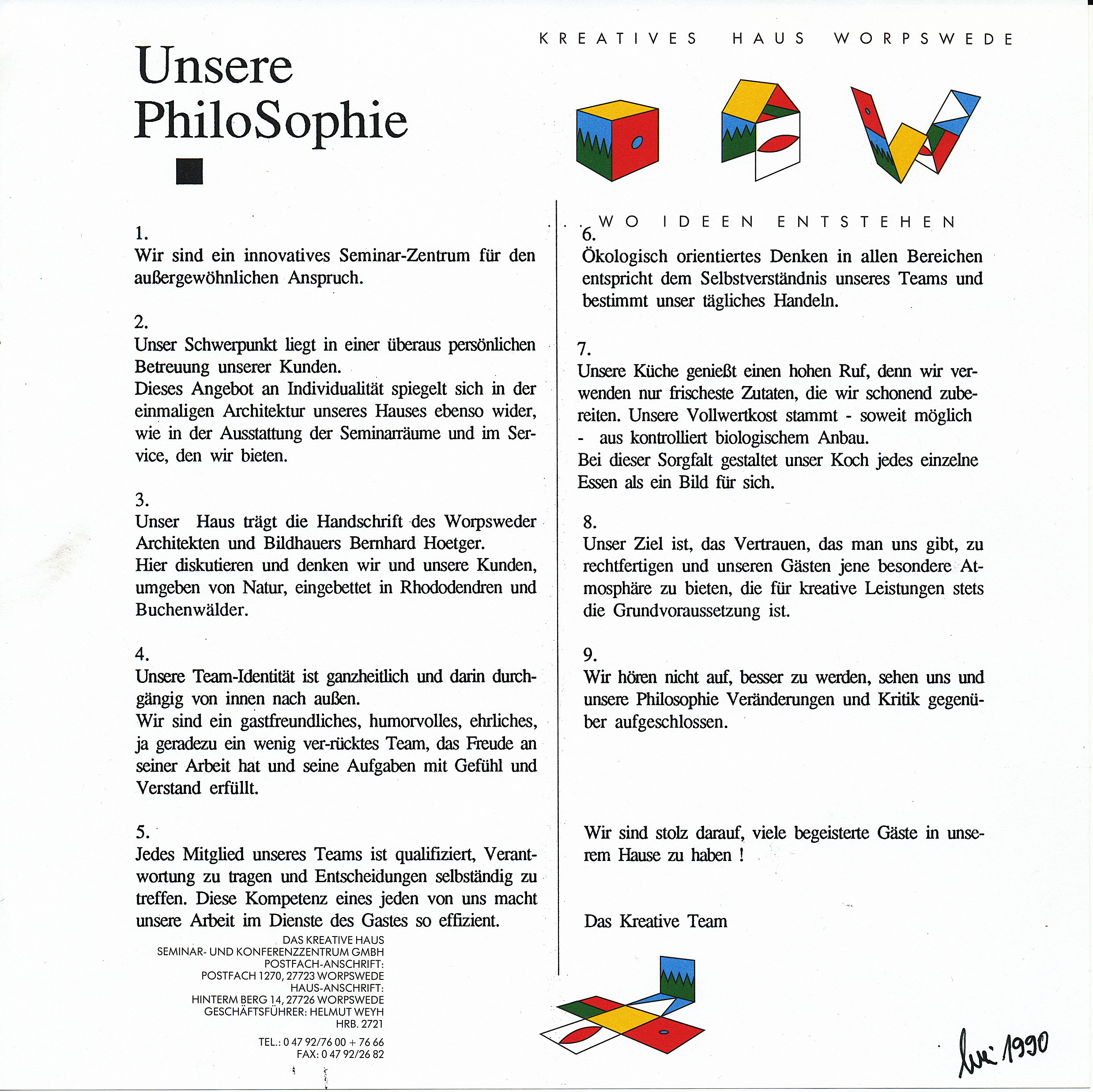 Mit Elan setzte Helmut Weyh diese Idee in die Tat um. 1984 pachtete er den Hoetger-Hof am Weyerberg in Worpswede, gestaltete das ehemalige Wohnhaus im Stil der New Age Bewegung zu einem Zentrum für Kreativität um, und machte
