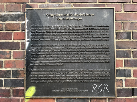 Kenotaph mit der Inschrift: „1914–1918 / 10000 Männer und Jünglinge zogen aus dieser Stadt in Krieg und Tod / Niemand hat größere Liebe denn die daß er sein Leben lasset für seine Freunde."