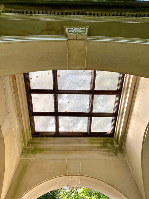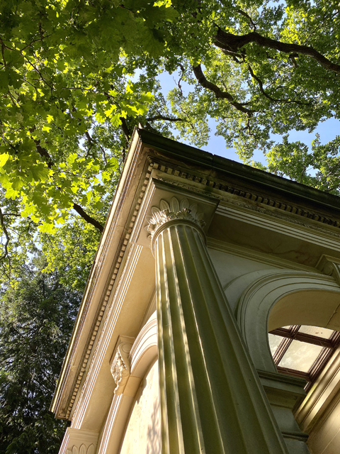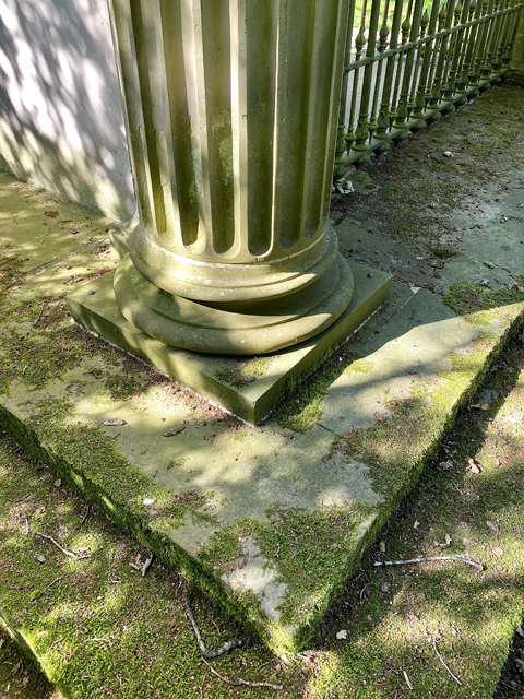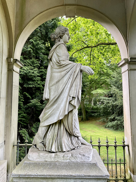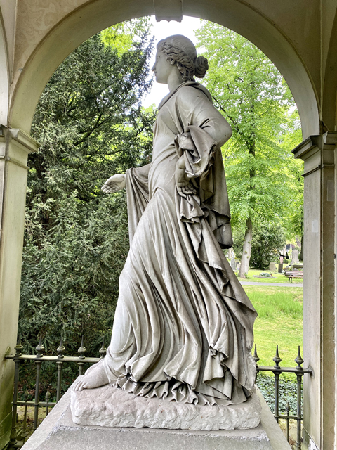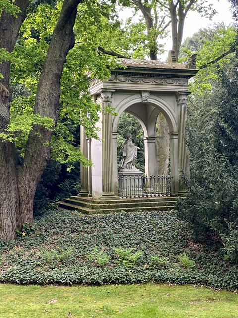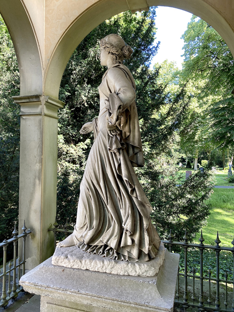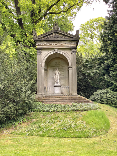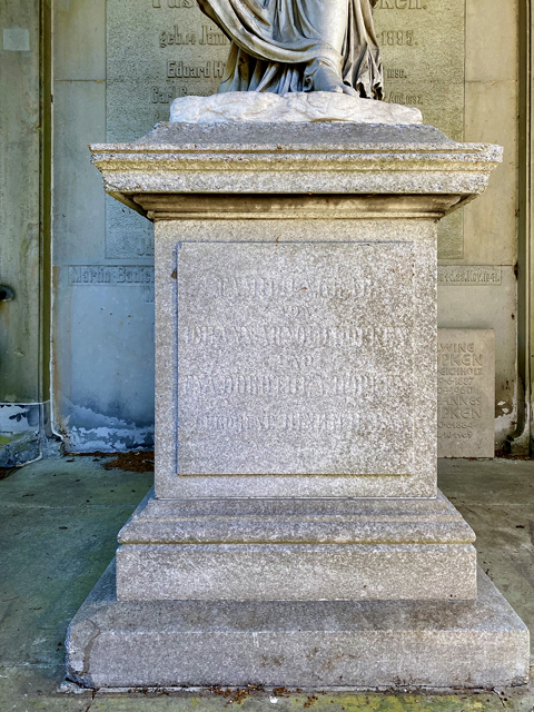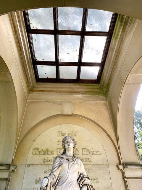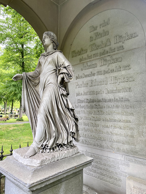 „Grabdenkmal der Familie Joh. Höpken auf dem Rhiensbergerfriedhofe, rechts vom Haupteingange, auf einem von Wasser umgebenen Hügel, 1875/76 von Bauinspector E. Böttcher erbaut. Im griechischen Styl. Obernkirchner Sandstein. Schöne Formen. Prachtvolles Standbild von C. Steinhäuser, Rom 1863, auf Granitsockel. Das Denkmal hat eine Breite von 4m, eine Länge von 4,28m und eine Höhe von 6m.“