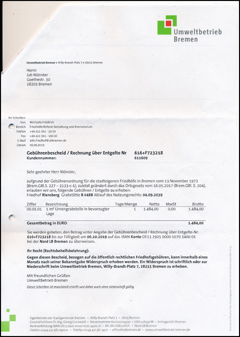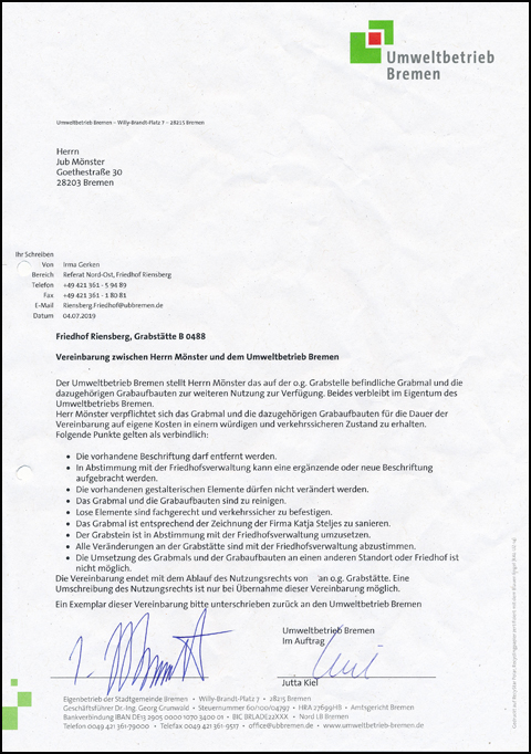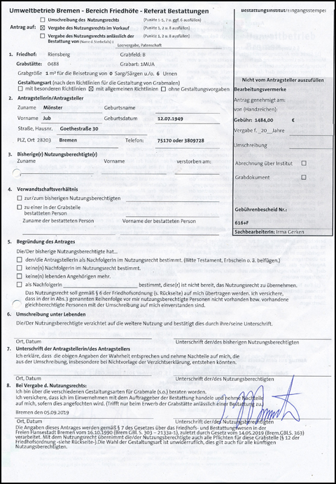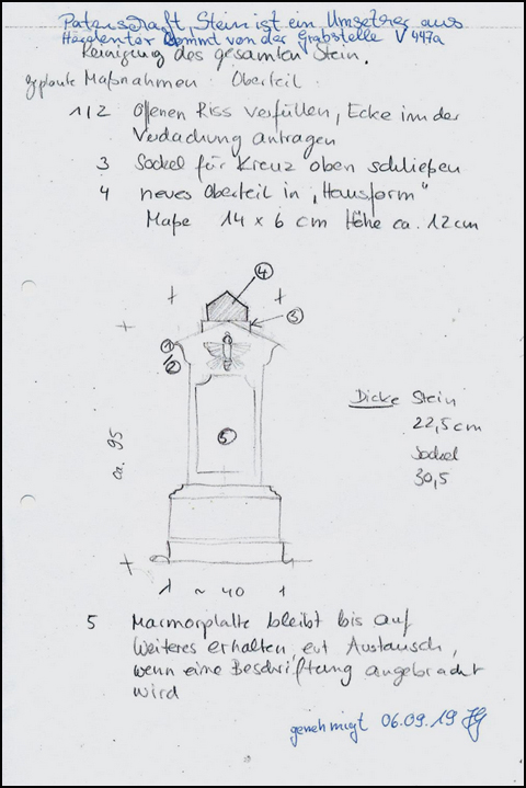 JM: Es wird ein Vertrag geschlossen, in dem man sich zur Erhaltung des Grabsteins und bestimmter anderer Aufgaben verpflichtet. Mein Vertrag richtet sich vorerst nach der Dauer der Anmietung meiner Grabstätte bis 2039. (Siehe 2.)