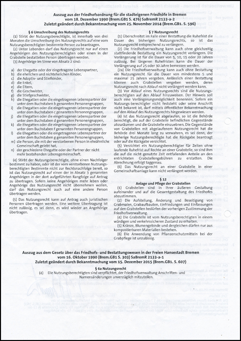 MW: Hast Du auch weitere Details deiner Beerdigung verbindlich in deinem Testament oder in einem Schriftstück bei der Friedhofsverwaltung geregelt? Gibt es Details zur Trauerfeier, Grabrede, Anzeige, Grabschmuck und die folgende Betreuung durch eine Gärtnerei oder durch die Familie bzw. Freude?