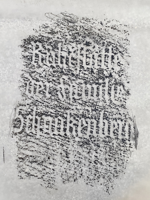 JM: Ich muß dies noch schriftlich hinterlegen, habe es aber in enger Absprache mit Frau Stelljes bereits mündlich festgelegt. Um die wunderbare, weiss-patiniert-unleserliche Frontplatte zu erhalten, soll eine Glasscheibe mit unseren eingefräßten Namen und Daten in geringem Abstand davor installiert werden.