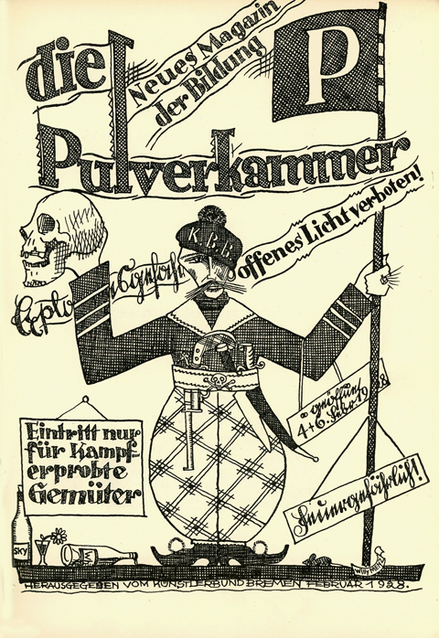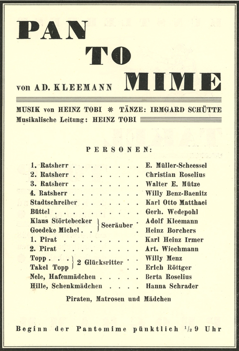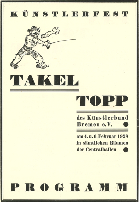 1928 - "Takel Topp", Illustrationen von Willy Menz in der Broschüre zum Fest vom "Künstlerbund Bremen e.V." am 4. und 6. Februar 1928 in sämtlichen Räumen der Centralhallen. Holzstich im Bildformat 14 x 20,5cm.