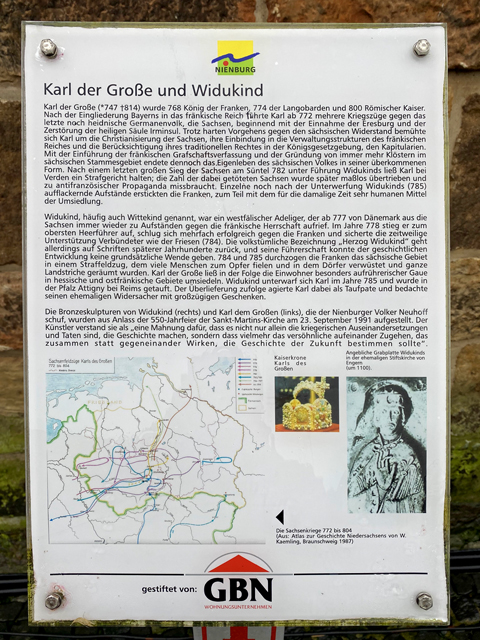 Zwei Bronze-Statuen (1991) von Volker Neuhoff auf dem Kirchplatz. Karl der Große und Sachsenherzog Widukind. Die Skulpturen symbolisieren die Aussöhnung zweier Erzfeinde. Anlass der Aufstellung war die 550-Jahr-Feier der Pfarrkirche St. Martin.